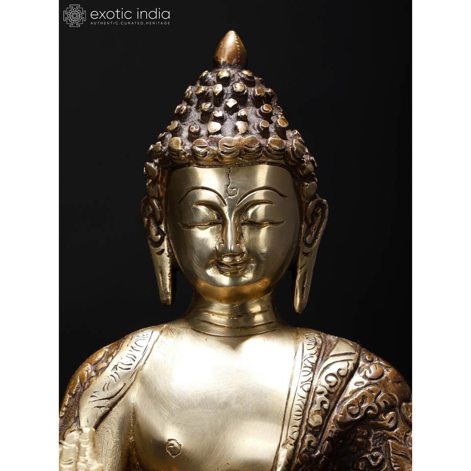 Sculpture en laiton faite à la main de 14 pouces du Seigneur Bouddha en posture de bénédiction sur socle en bois pour la décoration intérieure et le temple fabriqué en Inde
