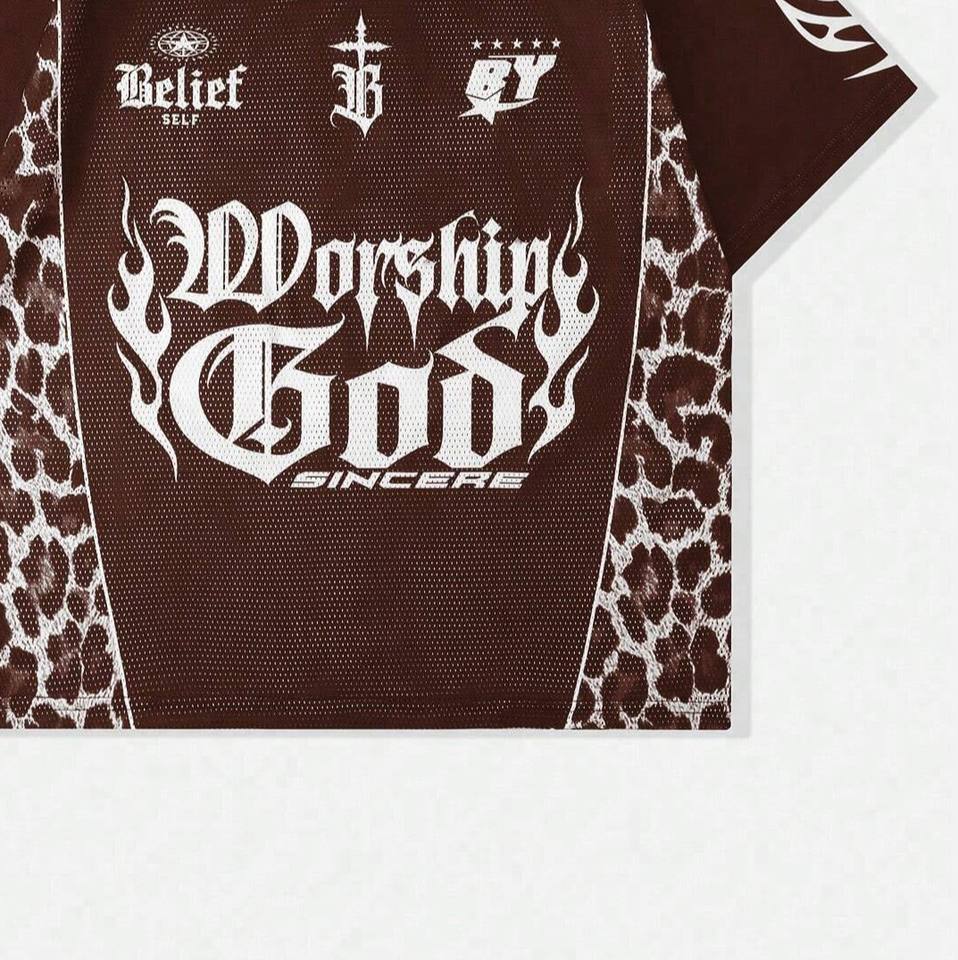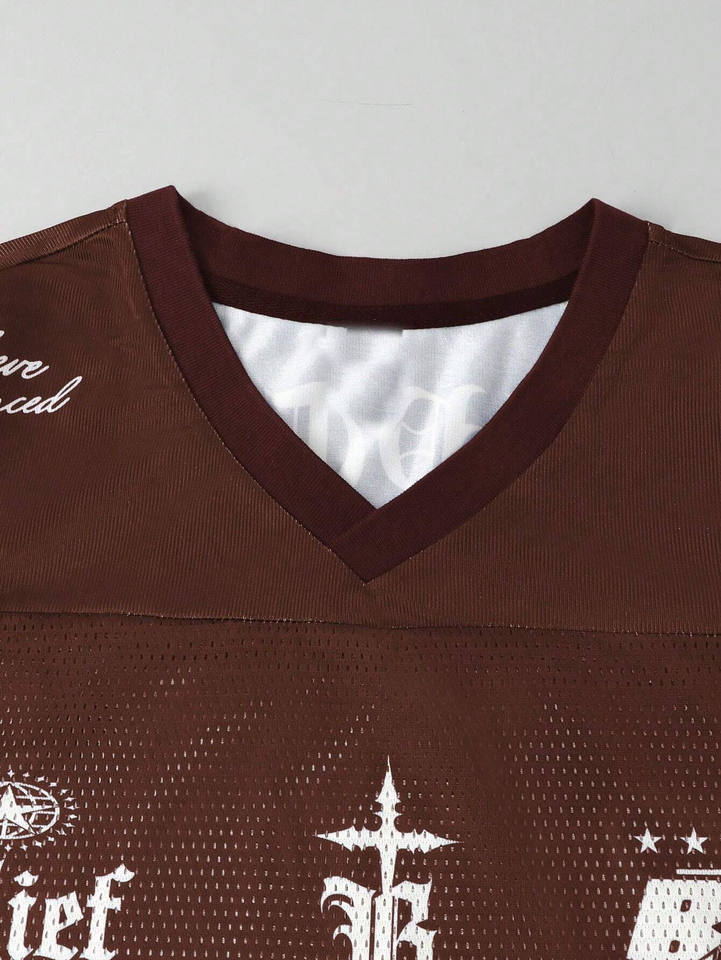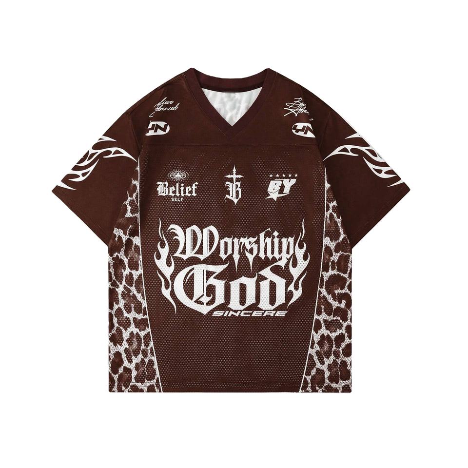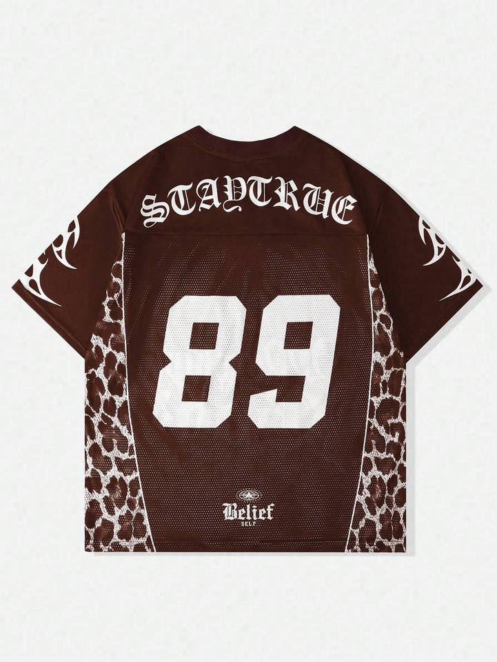 Maillot de football américain entièrement personnalisé en maille 100 % polyester marron avec motif graphique gothique et panneau léopard, col en V, conception OEM en gros