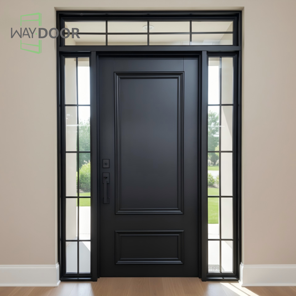 Portes d'entrée simples en bois massif de chêne acajou, entièrement personnalisées, insonorisées et bien scellées, avec transom et panneaux latéraux