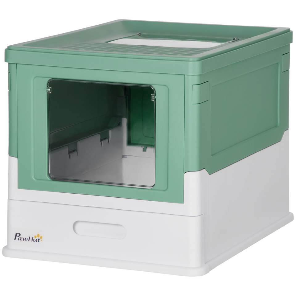 Bac à litière pour chat entièrement fermé avec entrée avant et sortie supérieure, accessoire en plastique vert et blanc pour compagnons félin