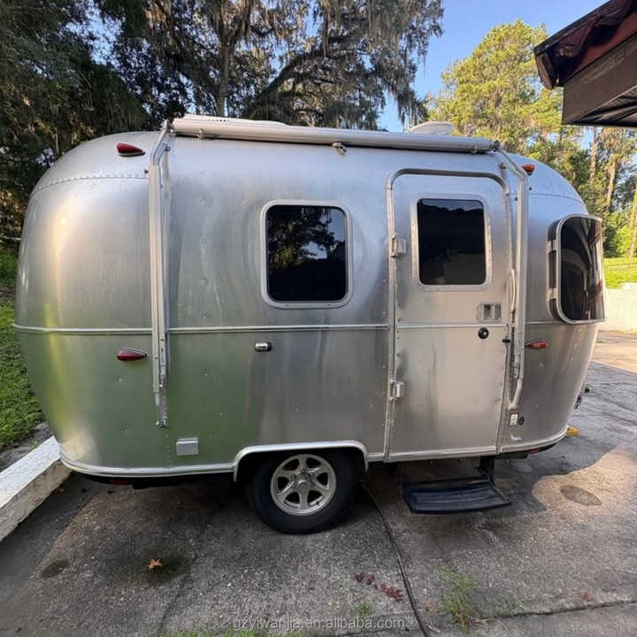 Caravane mobile entièrement équipée, style rétro, en aluminium argenté, pour la location en resort.