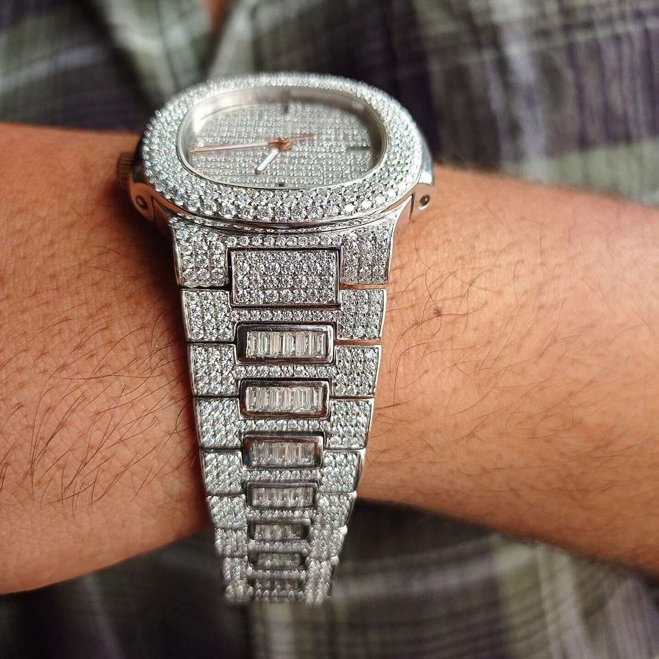 Montre de luxe entièrement sertie de pierres, style hip-hop, avec cadran analogique vieilli, cristal saphir, bracelet en acier inoxydable et silicone