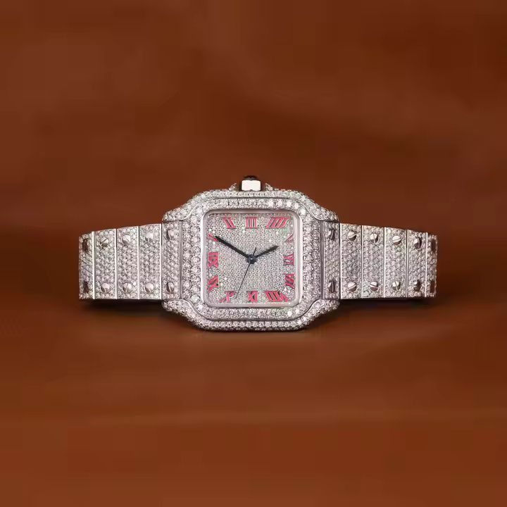 Montre-bracelet pour hommes entièrement glacée VVS Clarity Lab Grown Diamond Style de mode Sport antique Hip Hop avec chiffres romains roses
