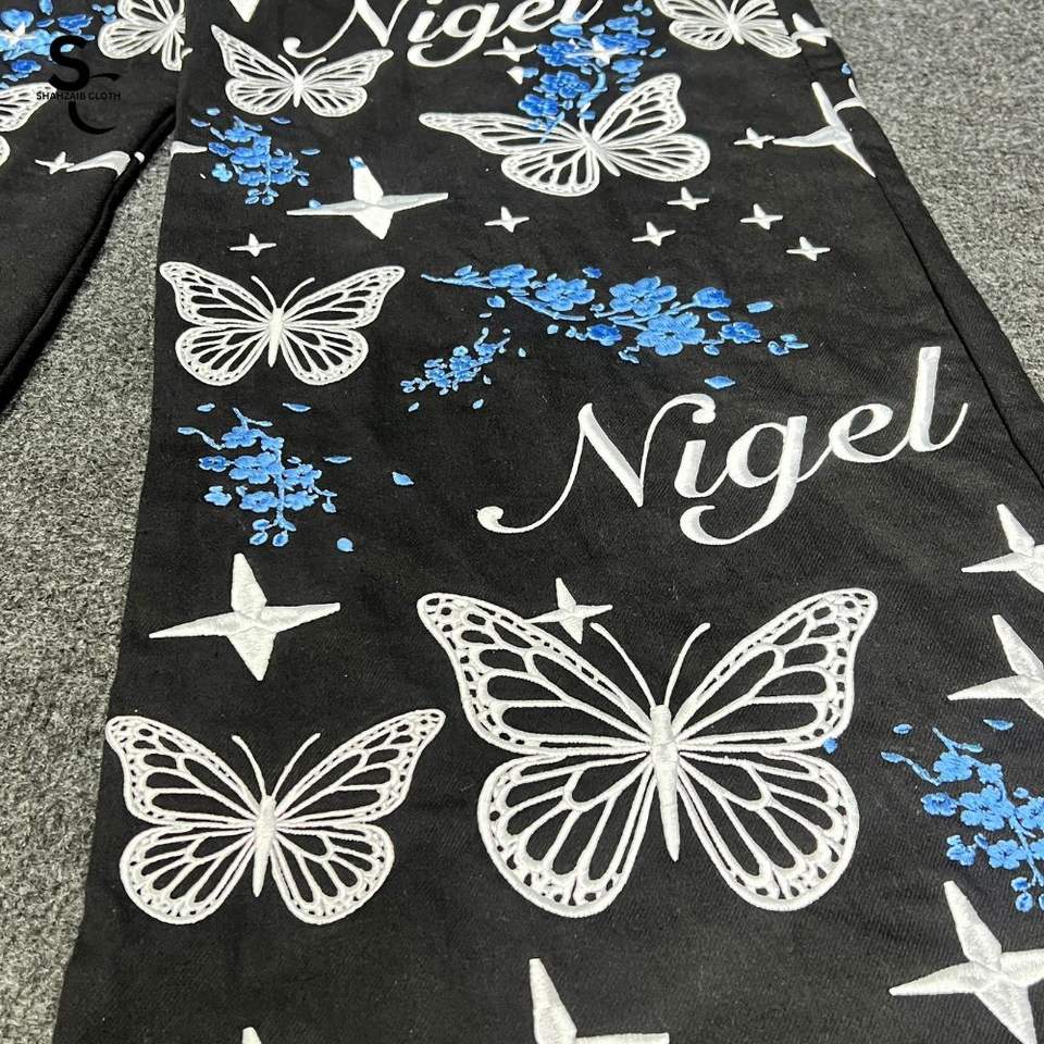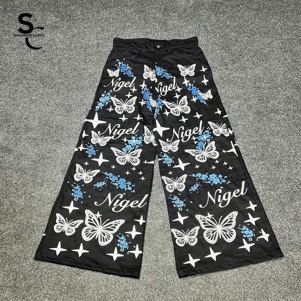 Jeans en denim à jambe large 100% coton biologique, entièrement brodés et personnalisables, taille haute, style streetwear vintage, avec service OEM ODM