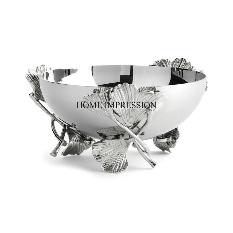 Bol de forme ronde poli miroir brillant entièrement argenté avec feuilles de gingko Support de base design Bol de décoration de table