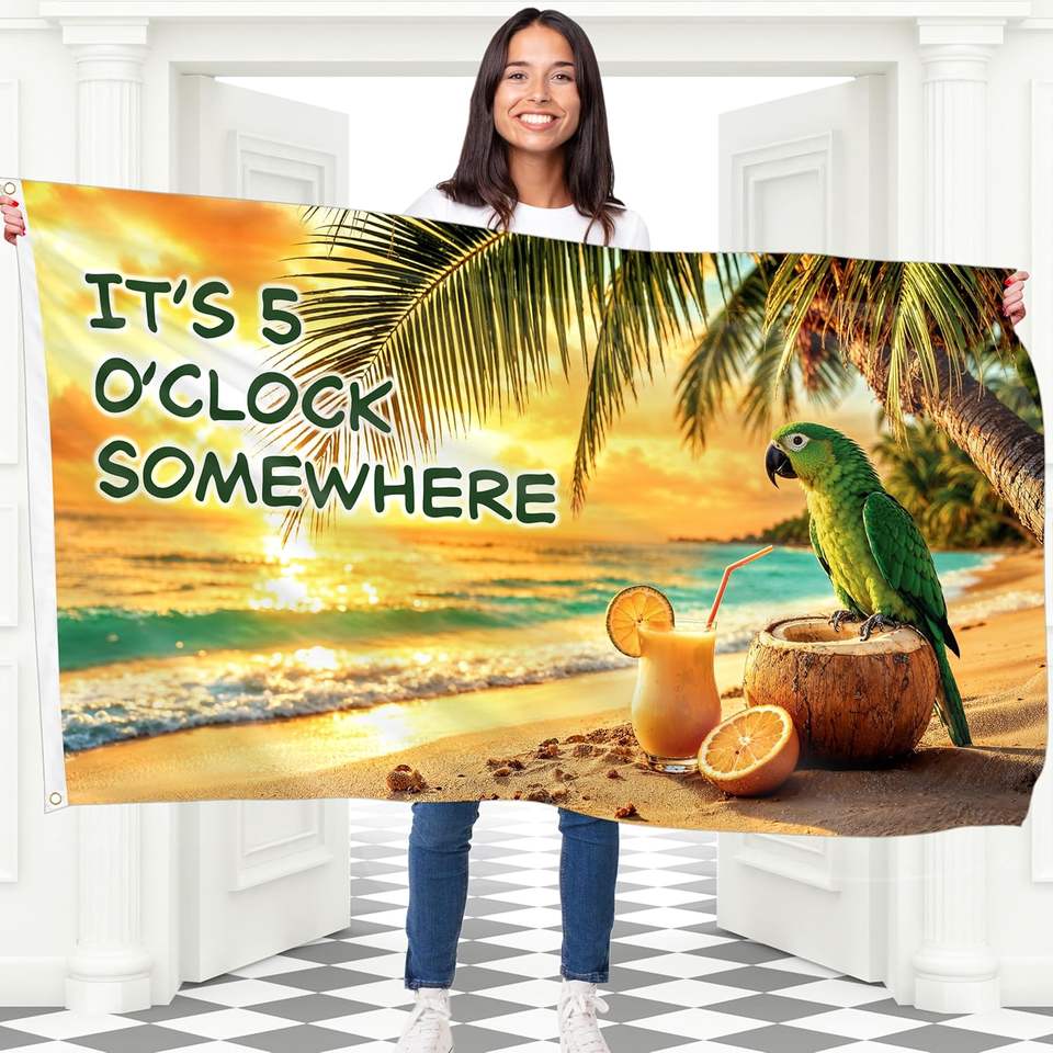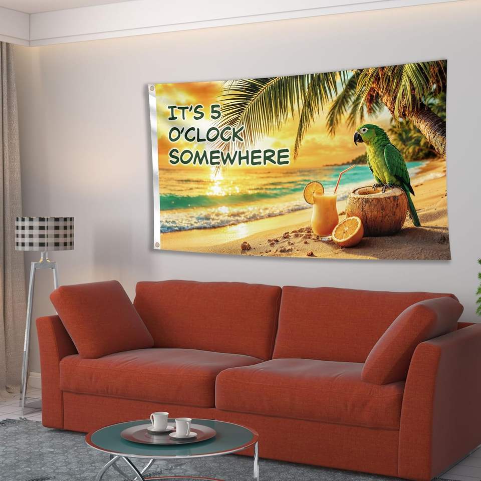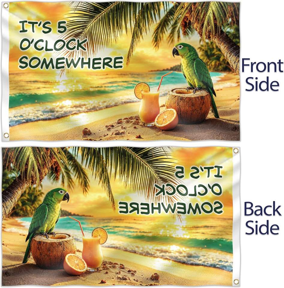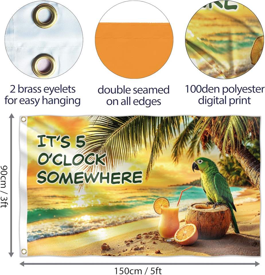 Drapeau drôle avec l'inscription « C'est 5 heures quelque part » et un perroquet | Bannière en polyester 110D double face 3x5 pieds | 2 œillets en laiton pour fête tropicale sur la plage