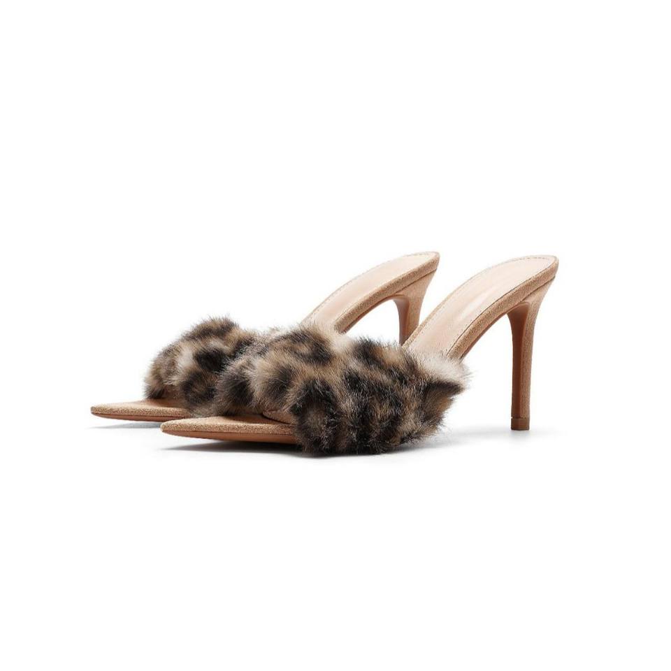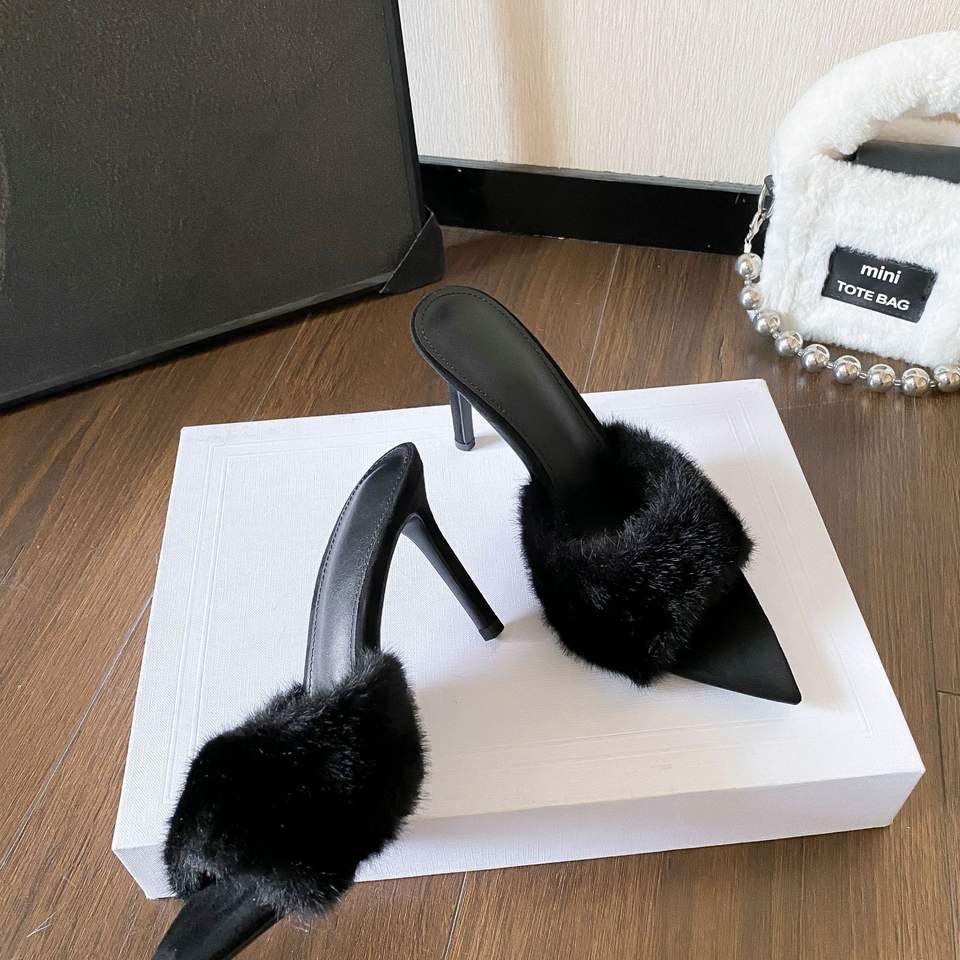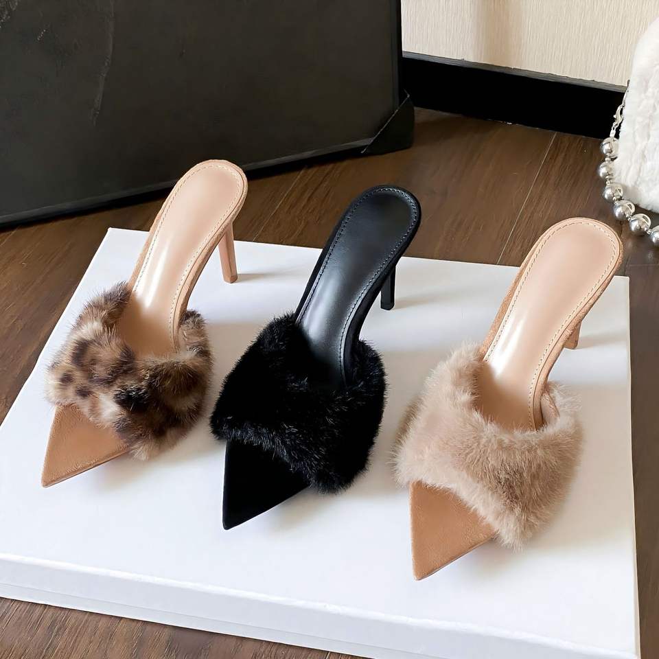 Mules à talons hauts en fourrure, bout ouvert, talons aiguilles, duveteuses, confortables et élégantes, design à une seule ligne, pour l'hiver, le printemps et l'automne