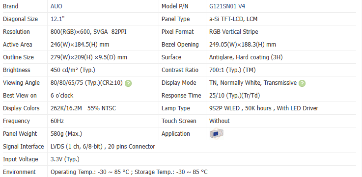 Tension d'écran de commande:3,3 V