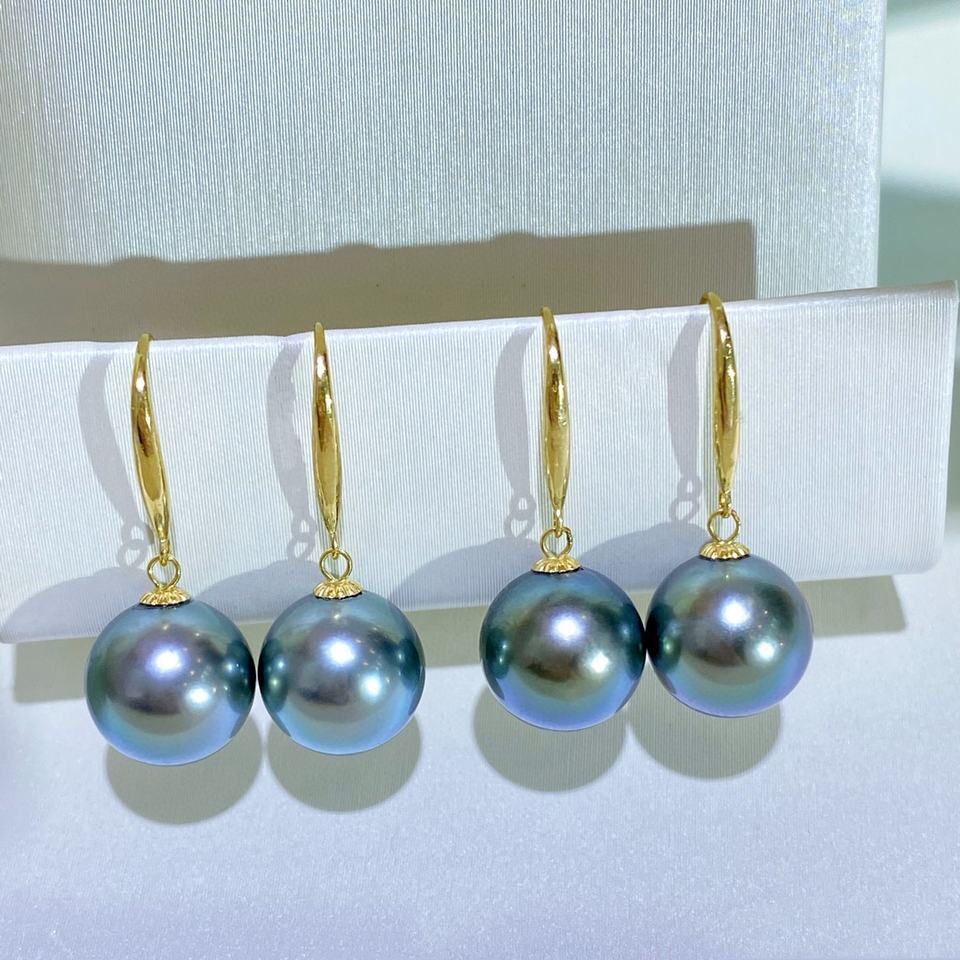 Boucles d'oreilles en or K G18 avec perles d'eau douce rondes blanches de 8 à 9 mm, forte luminosité, presque parfaites, avec trois zircons pour femmes