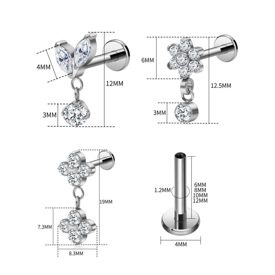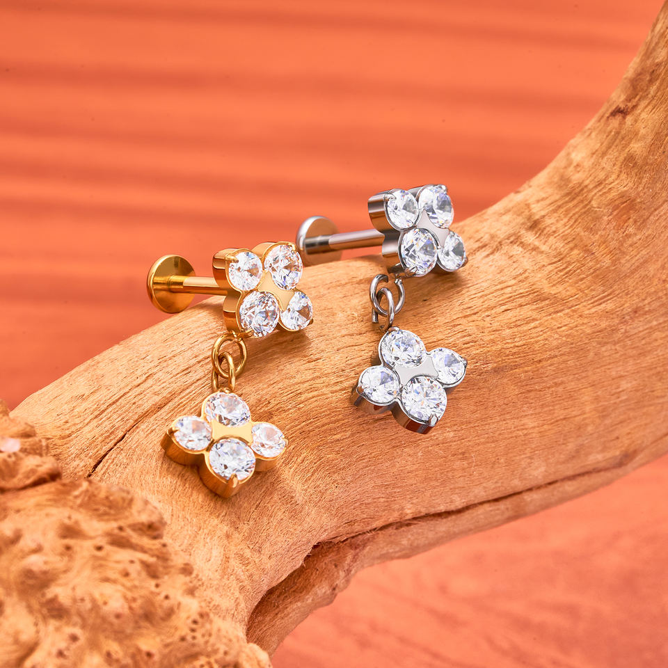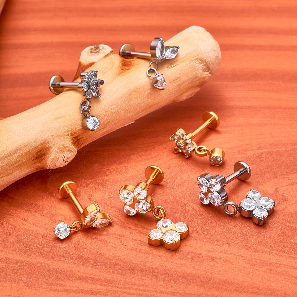 Boucles d'oreilles tendance en titane G23 16G avec double fleur CZ pendante et dos plat, pour piercing d'oreille, labret, lèvre, hélix, tragus, bijoux de fête