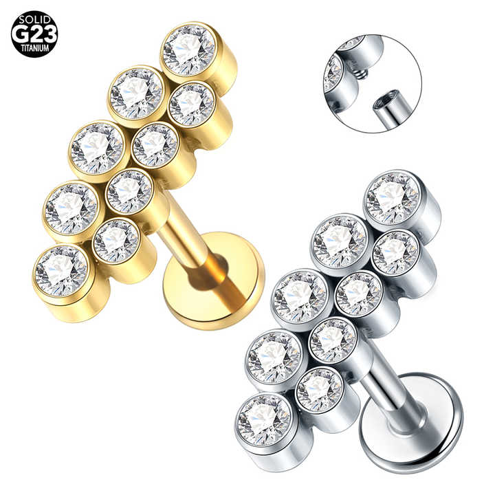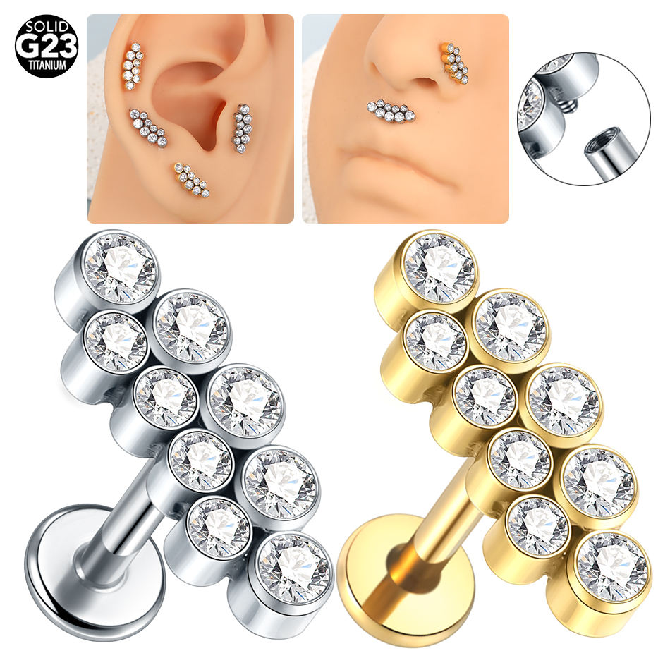 G23 Boucles d'oreilles filetées internes en titane Tragus Cartilage Helix Daith Piercing Stud Double Line 9 CZ Labret Piercing Lip Ring 16G