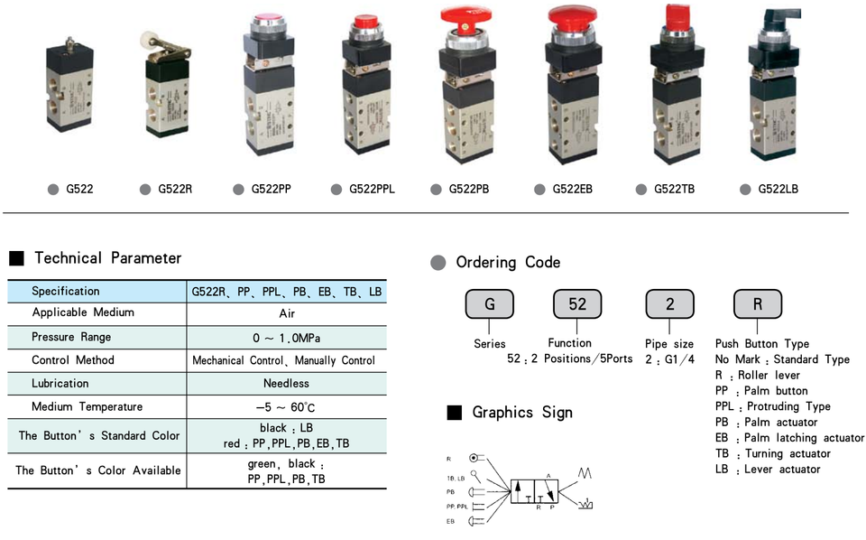 Vanne mécanique pneumatique à bouton-poussoir de type rouleau à 5 ports à 2 positions de haute qualité G522LB