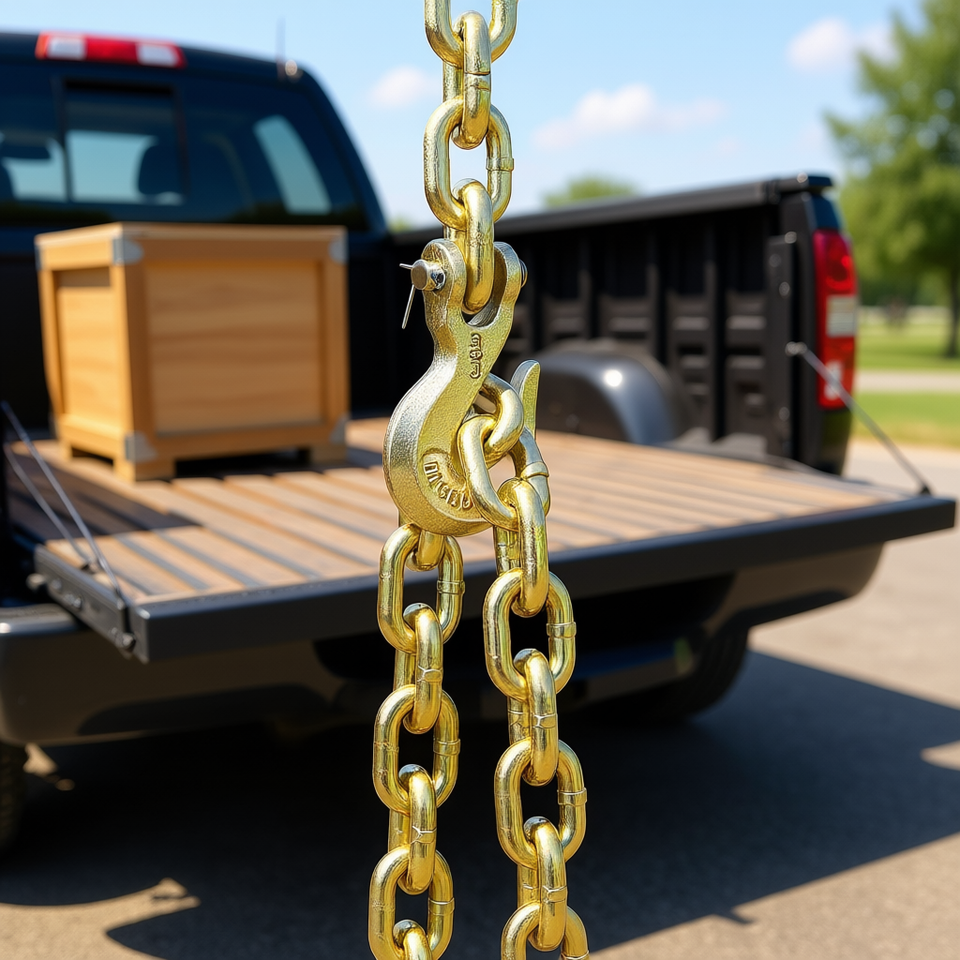 Chaîne de fixation G80 3/8 po x 10,3 pi 7100 lb avec deux crochets dorés