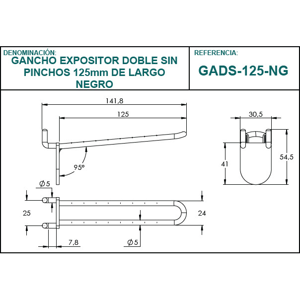 Crochet d'affichage GADS-125-NG noir 125 mm sans pointes Affichage à double crochet