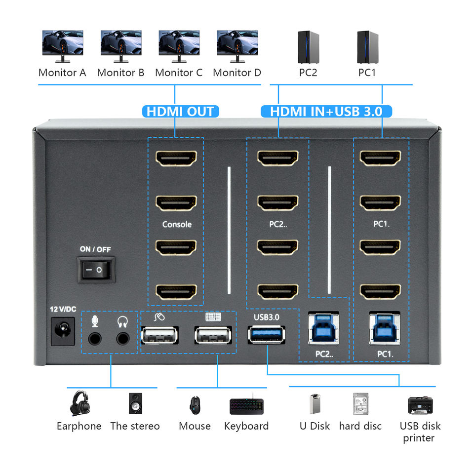 COMMUTATEUR KVM HDMI 2.0 4K 60HZ 2 ENTRÉES 4 SORTIES