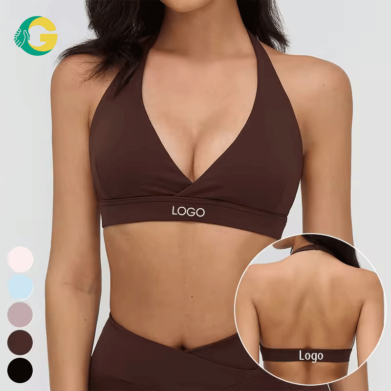Haut de sport dos nu à col en V profond de haute qualité GC, avec logo personnalisé, pour la course, la gym, le fitness, soutien-gorge de yoga halter, soutien-gorge de sport pour femme