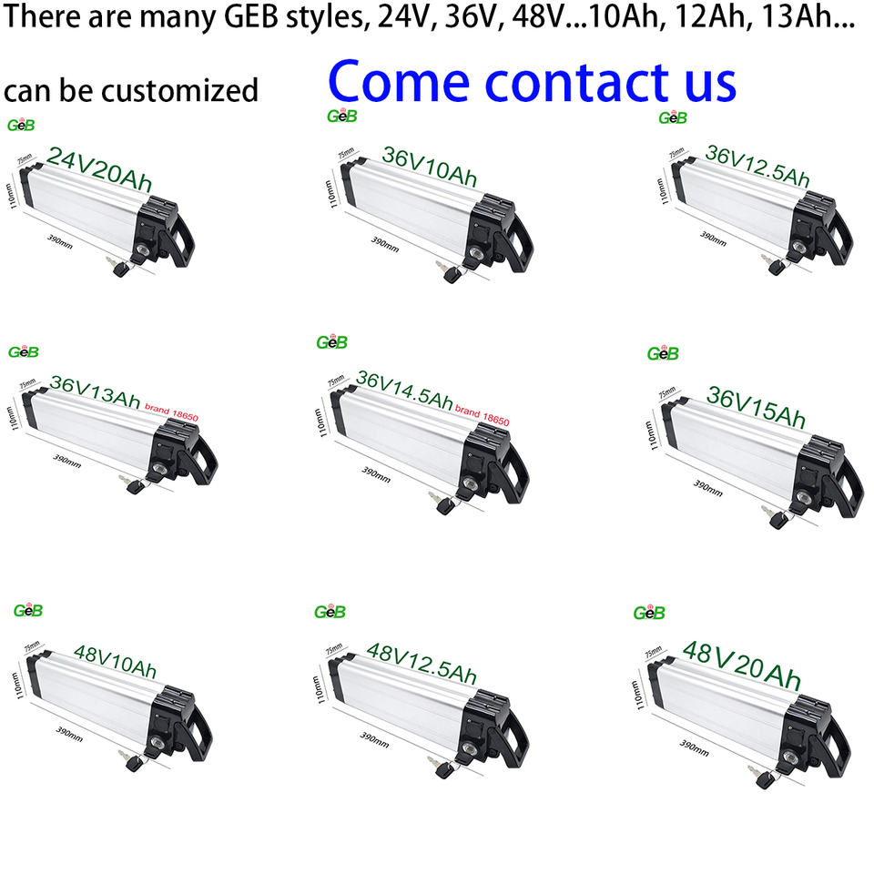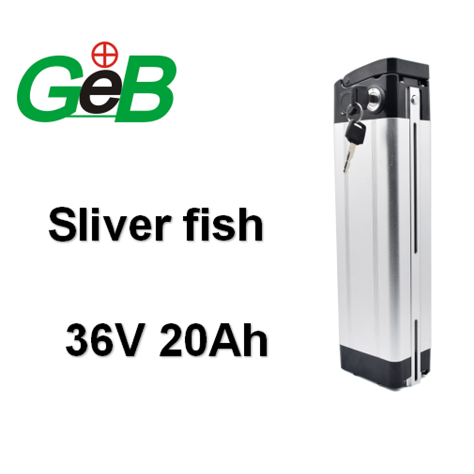 GEB Offre Spéciale Sliver Fish 36v 48v 10ah 20Ah 500W 1000W Batterie de vélo électrique avec chargeur 2A au lithium pour vélo rechargeable