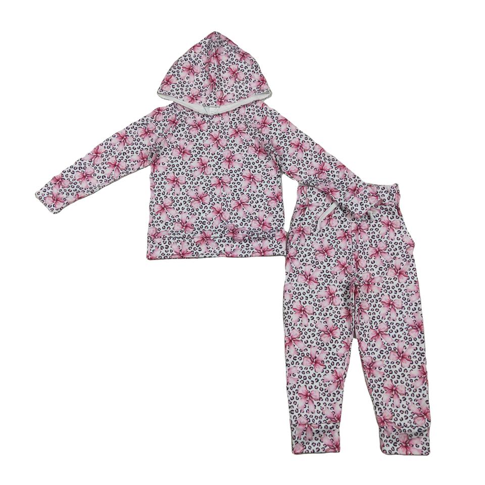 GLP2854 RTS Little girl Pink bows leopard hoodie outfits kids wholesale girl long sleeve child spring and fall clothing set