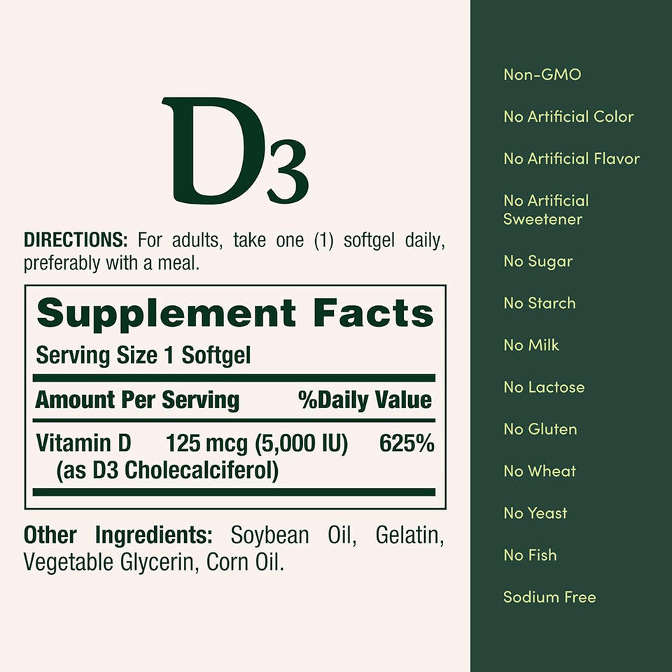 Ingrédient principal:Vitamine D3 (sous forme de cholecalciférol), huile de soja, gélatine, glycérine végétale, huile de maïs