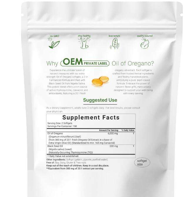 GMP ISO 180 Usine Personnalisé 2-en-1 6000mg Huile d'Origan & Capsules d'Huile de Graine Noire Adulte Antioxydant Supplément de Soutien Digestif