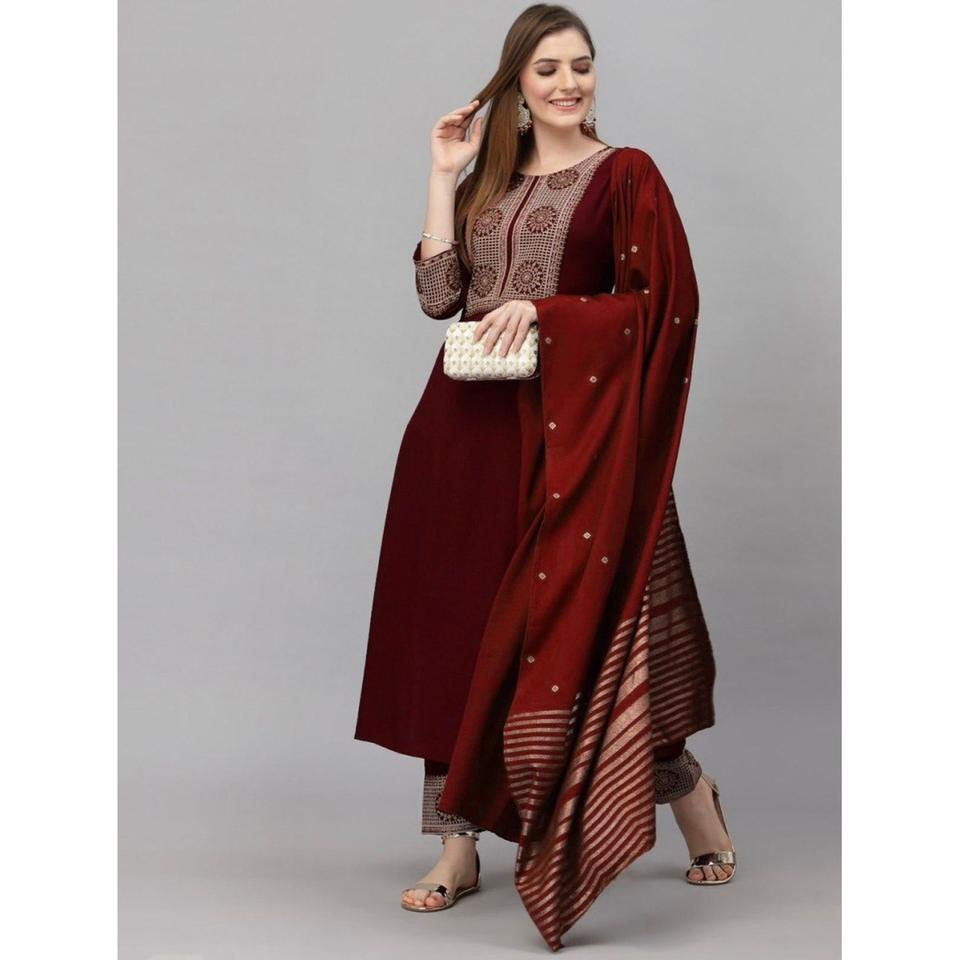 GORGEOUS HEAVY RAYON FOIL WORK TOP PANT WITH DUPATTA MARON