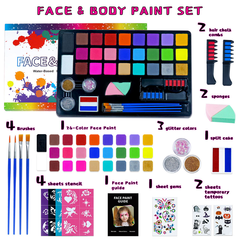 Kit de Peinture Professionnel GP Non Toxique 26 Couleurs à Base d'Eau Lavable pour Visage et Corps, Maquillage Enfants pour Fêtes, avec Paillettes et Pochoirs
