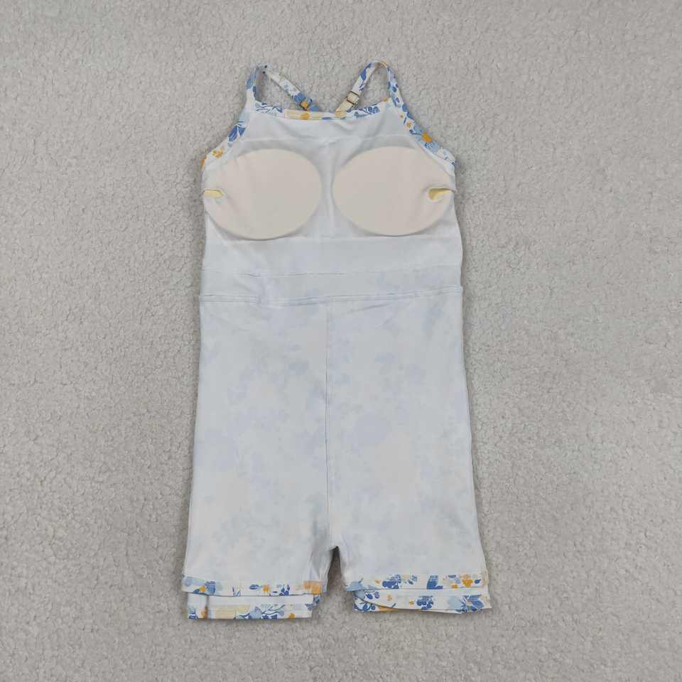 Robe de yoga personnalisée GSD3565 pour petite fille, motif floral bleu et jaune, haute qualité, vente en gros pour enfants, sans manches, athlétique, été