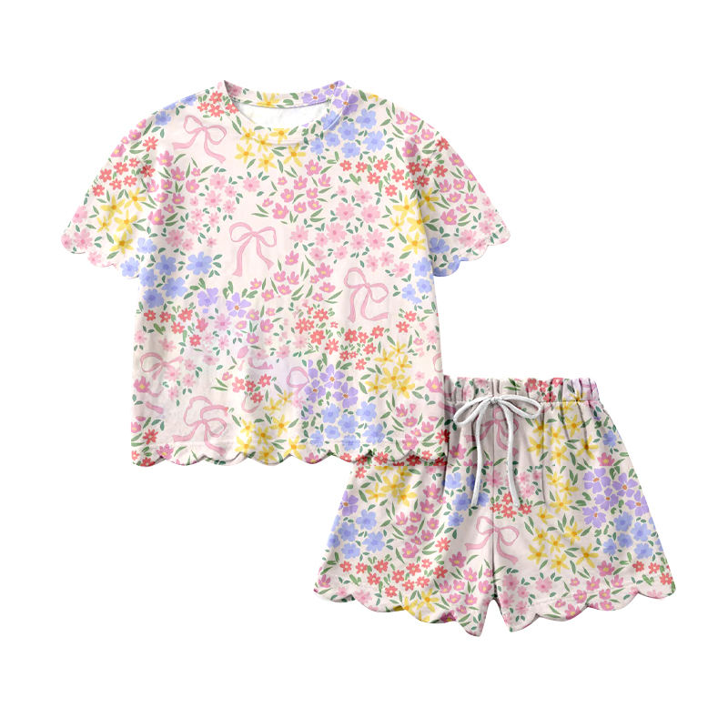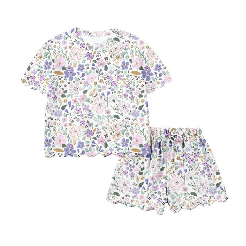 GSSO3266 CUSTOM Ensemble de vêtements pour petite fille active, imprimé fleurs vertes, vente en gros, ensemble à manches courtes pour enfant