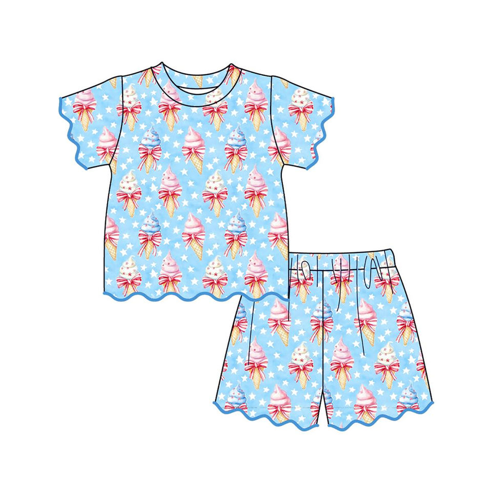 GSSO3546 Ensemble personnalisé pour petite fille active, tenue à manches courtes à volants avec imprimé étoiles et nœuds du 4 juillet, vente en gros pour enfants