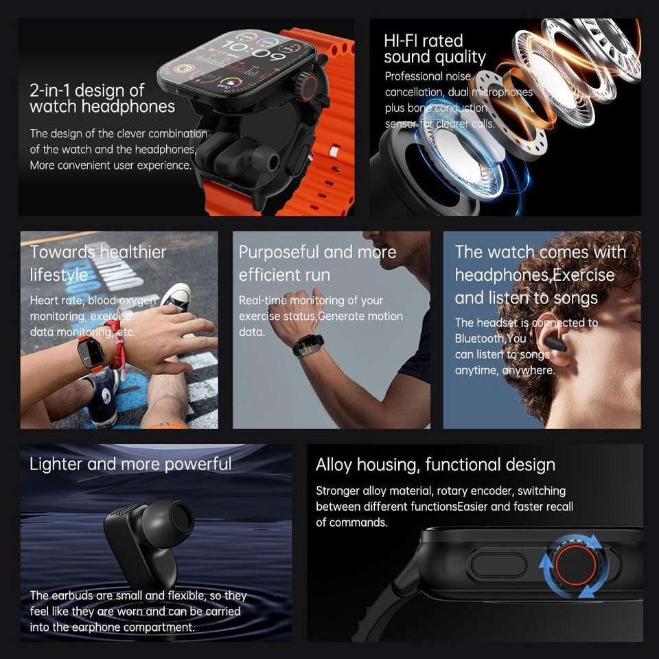 GT8 2 in 1 Smart Watch With Earbuds Smartwatch TWS Bt Earphone Heart Rate Blood Pressure Monitor Sport Watch for Men Women
