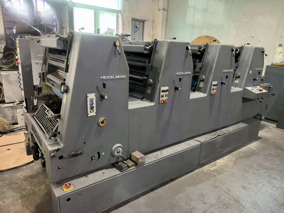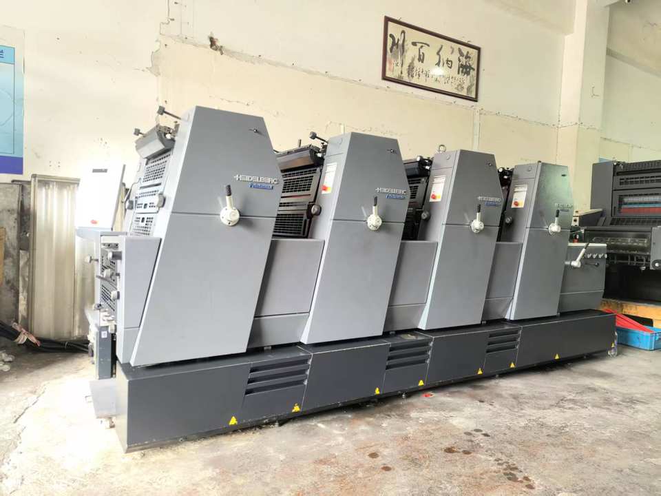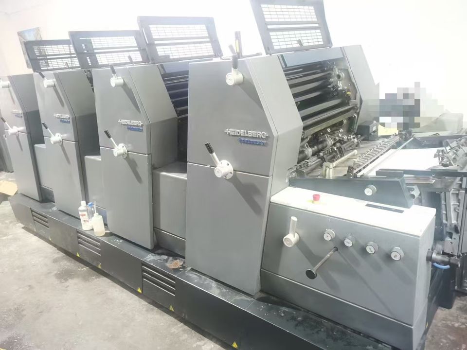 Presse d'impression offset GTO52, fabriquée en Allemagne en 2008, papier offset quadricolore, Heidelberg, impression à l'encre multicolore.
