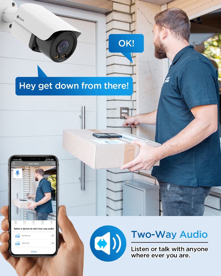 Détection de mouvement, Vision nocturne, Audio bidirectionnel, Imperméabilisez/protégez contre les intempéries
