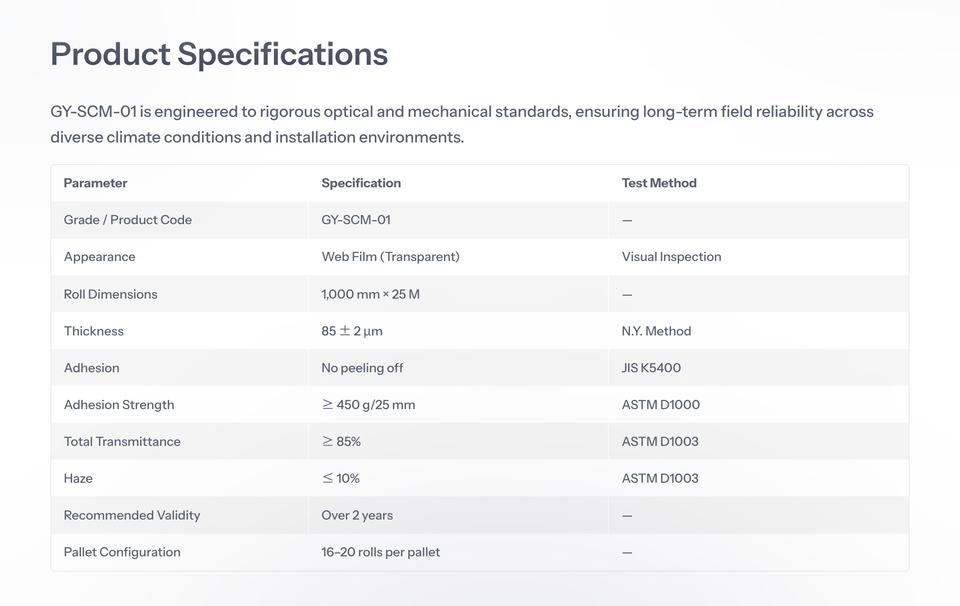 Film PET transparent GYC modèle GY-SCM-01 (1000 mm x 25 m) pour améliorer l'efficacité de la conversion d'énergie solaire des panneaux solaires