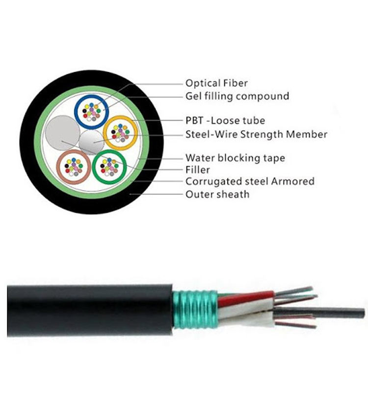 Câble optique GYTS GYTA 2 4 6 8 12 24 36 48 72 96 144 288 fibres G652D monomode, tube lâche torsadé, blindé