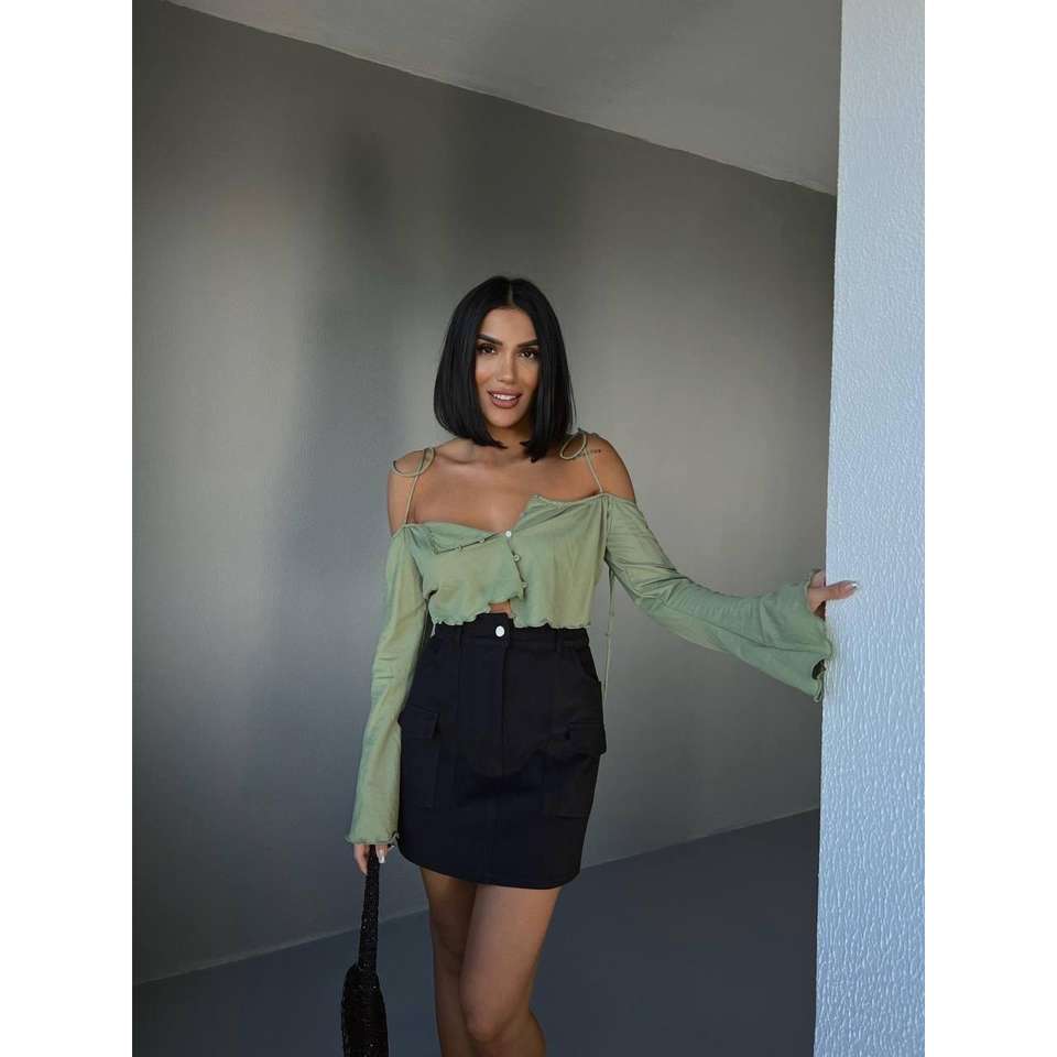 Gabardine Short Skirt Pocket Detail Modern Gothic Genuine Leather Satin Silk Material Embroidery Ruffle Decoration Black Color