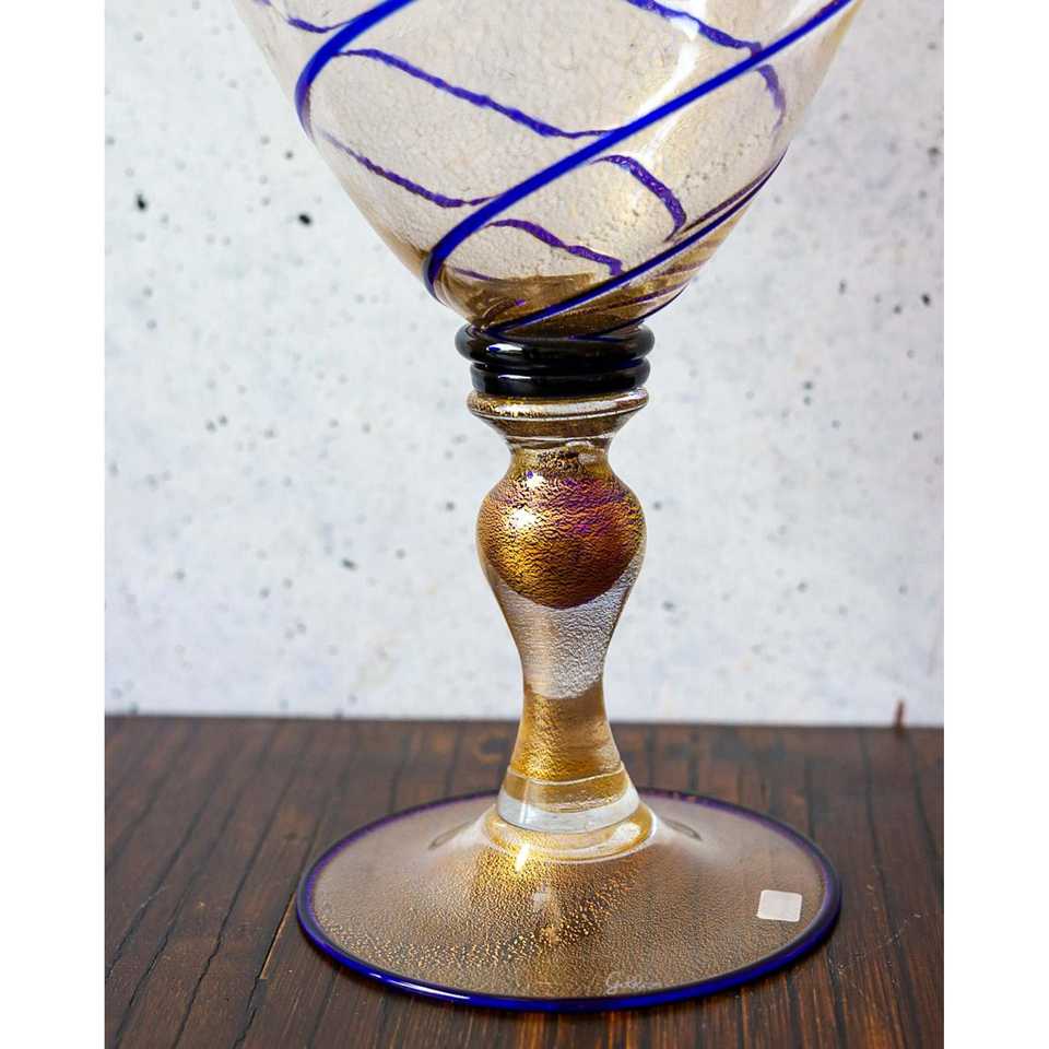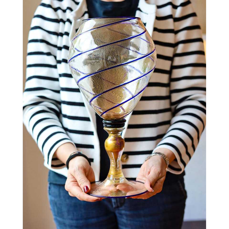 Vase en verre soufflé Gabbiani, grand modèle, transparent avec des rayures bleues, design minimaliste et luxueux pour les arrangements floraux à la maison, matériau en cristal