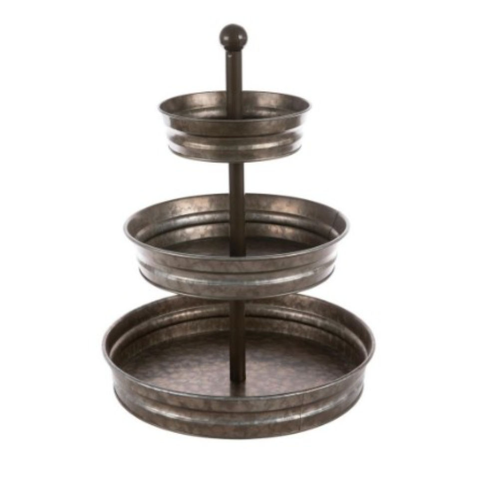 Présentoir Rond Galvanisé à 3 Niveaux, Support à Cupcakes en Métal Style Ferme avec Bords Festonnés, Plateau de Service Vintage pour Desserts