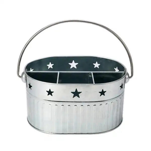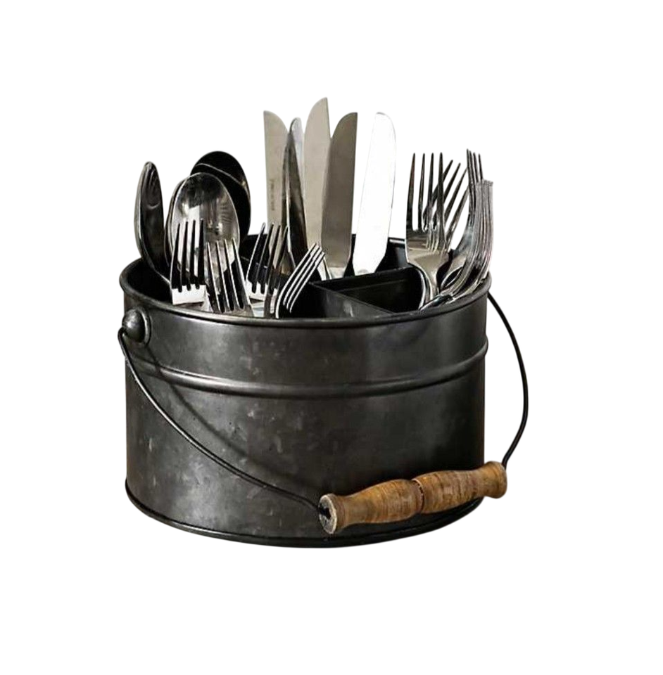 Organisateur de couverts en métal galvanisé avec poignée en bois, support à couverts pour comptoir de cuisine, buffet, barbecue et fournitures de fête