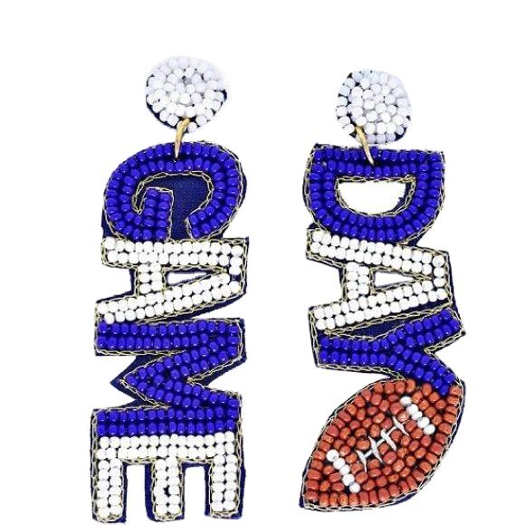 Boucles d'oreilles Jour de jeu bleu royal Boucles d'oreilles de broderie perlée et boucles d'oreilles de football perlées jour de jeu blanc