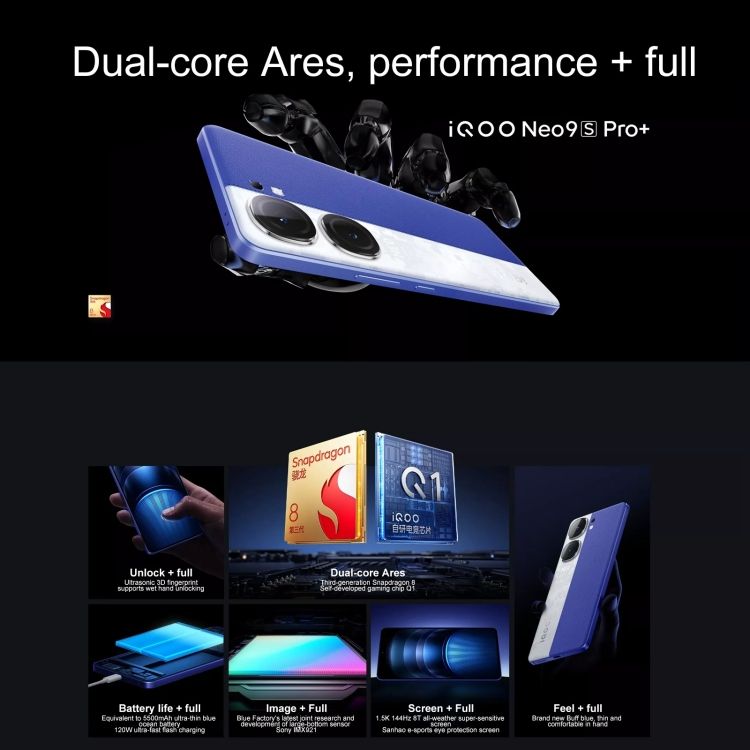 Téléphone de jeu VlVO IQOO Neo9S Pro+ avec écran de 6,78 pouces, Android 14, réseau 5G prenant en charge Google Play