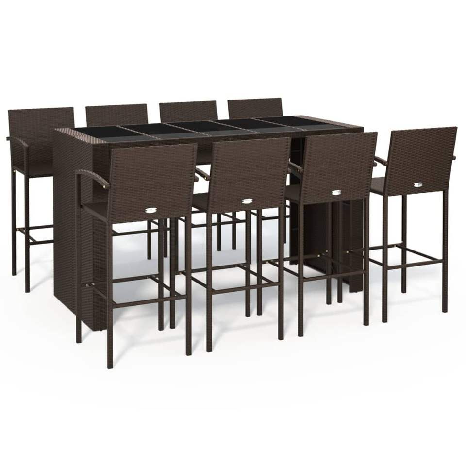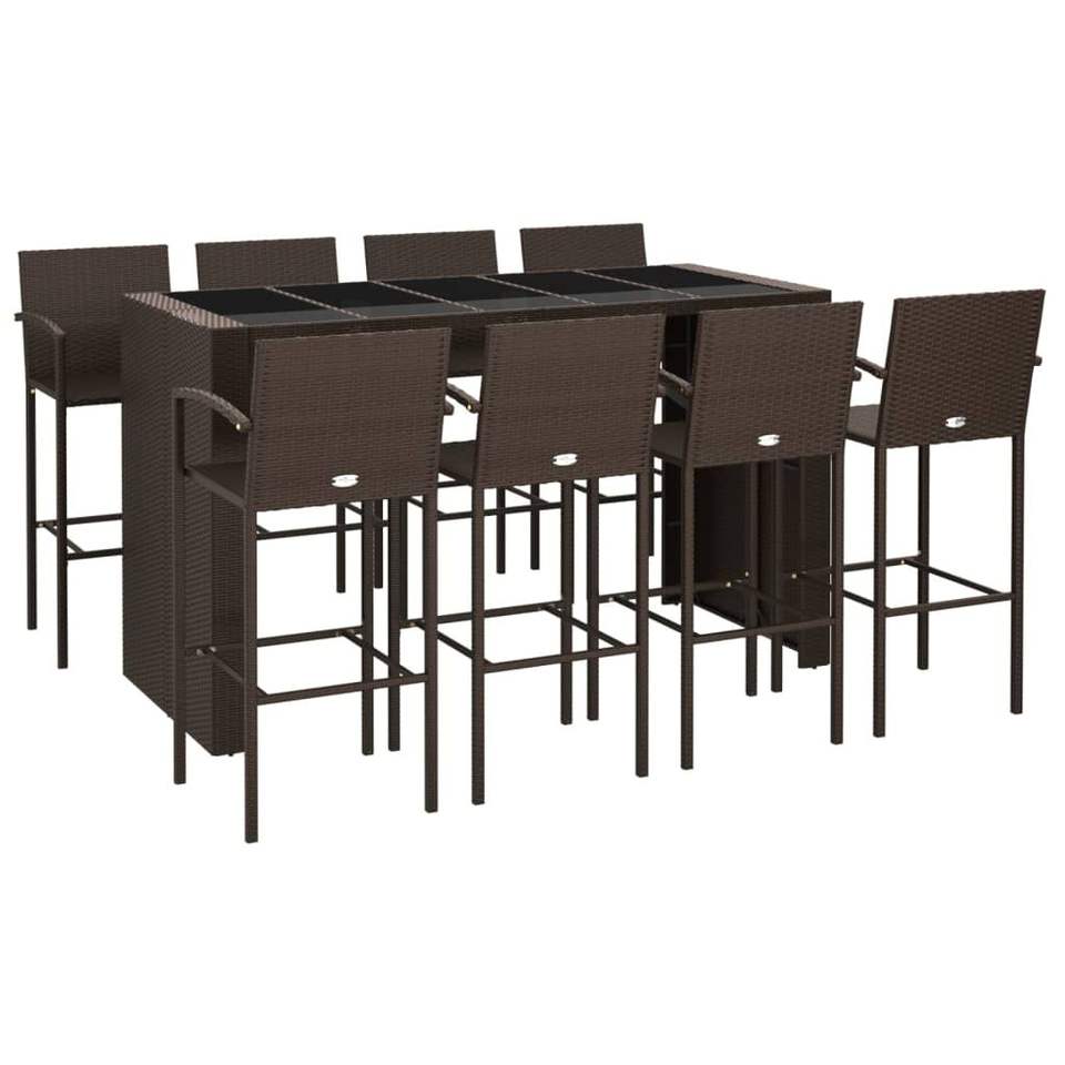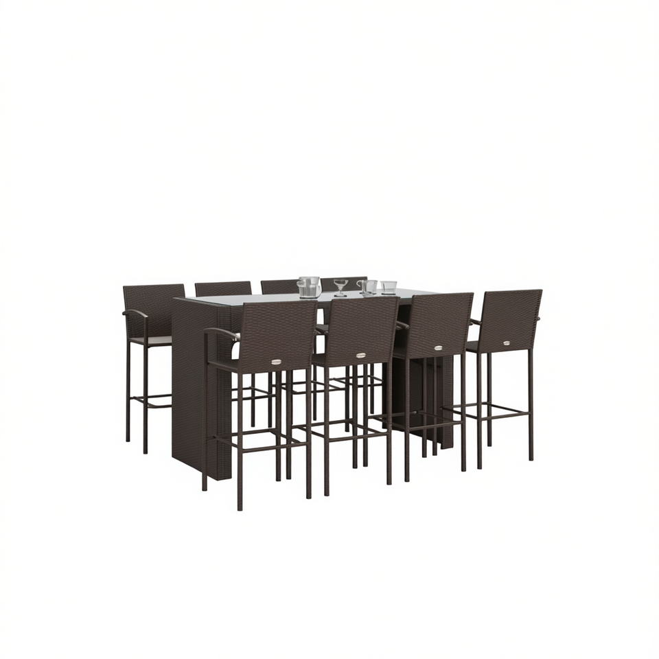 Ensemble de bar de jardin en rotin brun avec structure en acier et verre trempé, mobilier d'extérieur 8 places, design contemporain