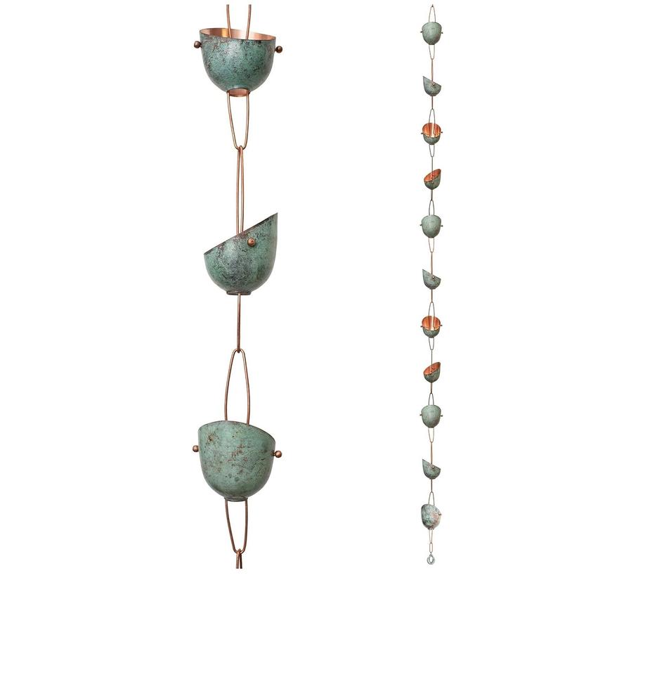 Chaîne de pluie en fer forgé pour jardin, embellissant le paysage tout en guidant l'eau de pluie à travers des formes métalliques artistiques