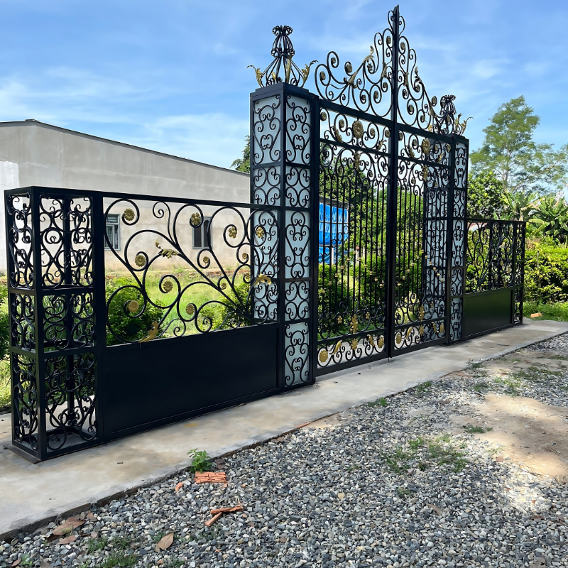 Porte d'entrée de jardin en fer forgé fabriqué au Vietnam détails forgés décoratifs en utilisant des matériaux locaux et des techniques artisanales