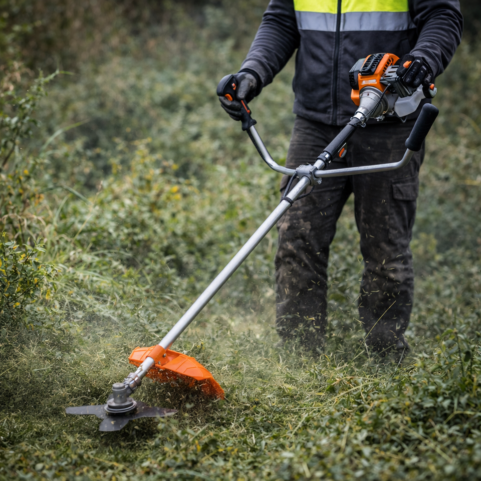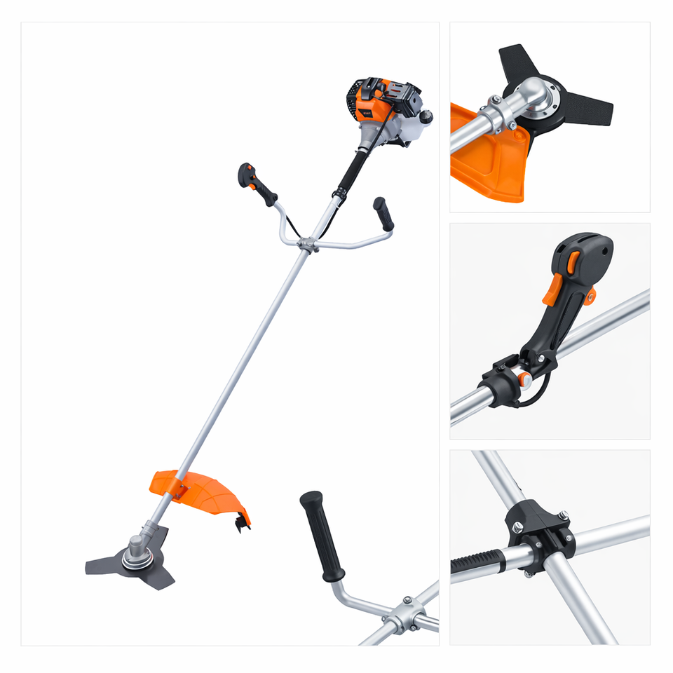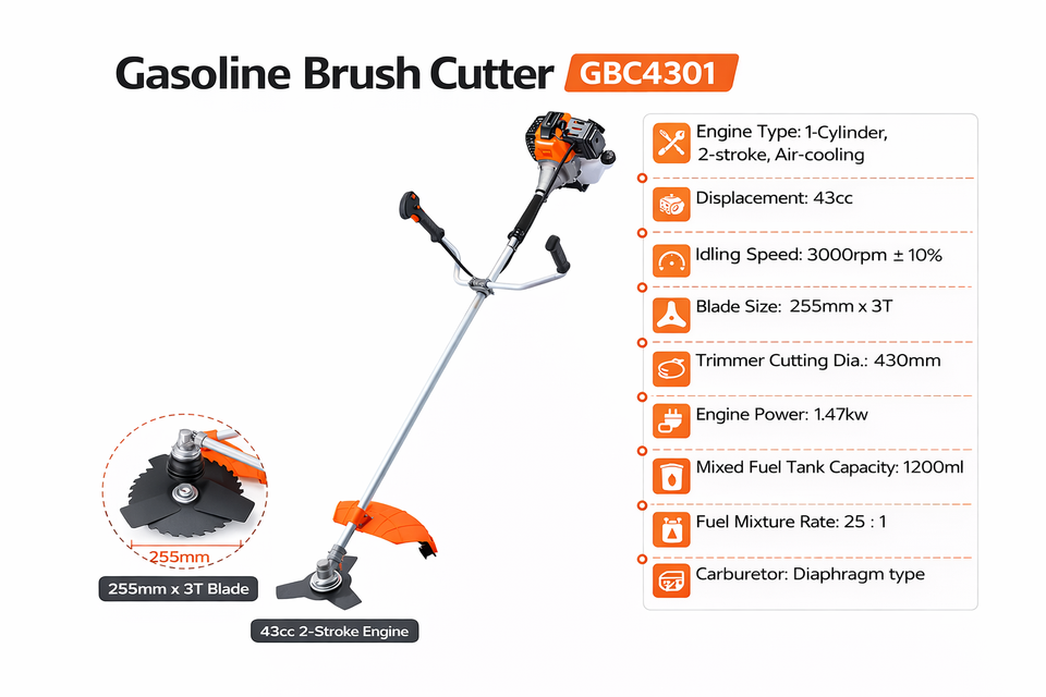 Débroussailleuse à essence 43cc 1,47 kW Moteur 2 temps refroidi par air Lame 3T de 255 mm Diamètre de coupe 430 mm Réservoir de carburant 1200 ml Taux de mélange 25:1