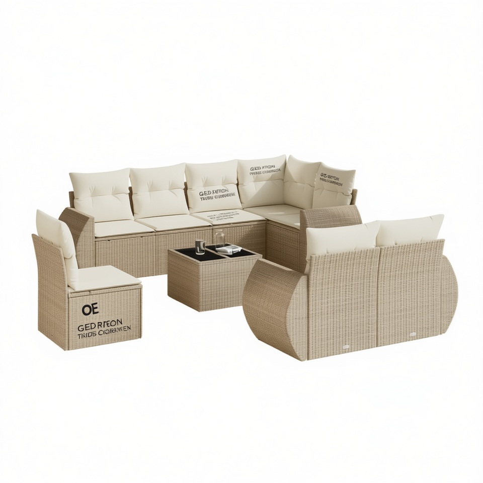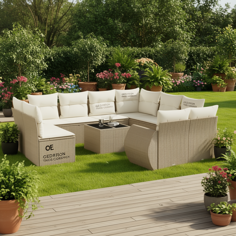 Ensemble de canapé de jardin en rotin beige Gedrion 9 pièces, meubles modulaires d'extérieur avec coussins en mousse haute densité