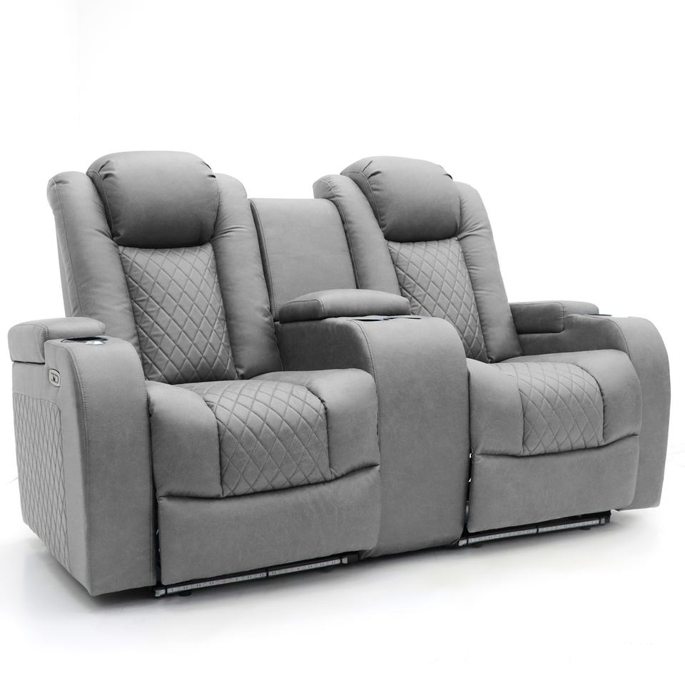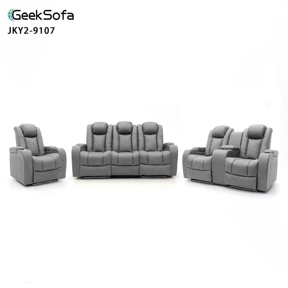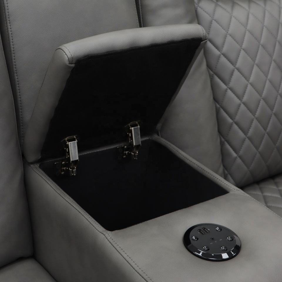 Canapé inclinable électrique Geeksofa moderne 6 places en bois massif pour home cinéma avec console et table pliante, éclairage d'ambiance LED
