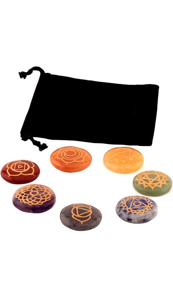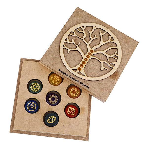 Ensemble de disques gravés 7 chakras en pierres précieuses, personnalisable, boîte en bois étanche, pierres naturelles, vente en gros, cristaux Amayra, décoration intérieure