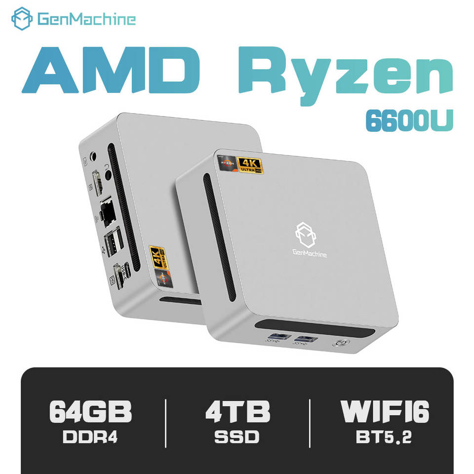 Mini PC GenMachine Ryzen 5 6600U AMD Radeon 6 cœurs 12 threads 2.5G LAN Wifi 6 BT 5.2 2HD 4USB 3.0 USB4 3 écrans RAM 16G
