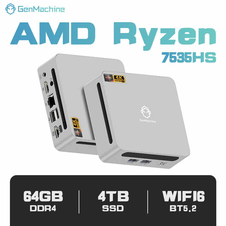 Mini PC GenMachine Ryzen 5 7535HS AMD, 6 cœurs, 12 threads, LAN 2,5 G, Wifi 6, BT 5.2, 2HD, 4USB 3.0, USB4, 3 écrans, RAM 16G LPDDR5