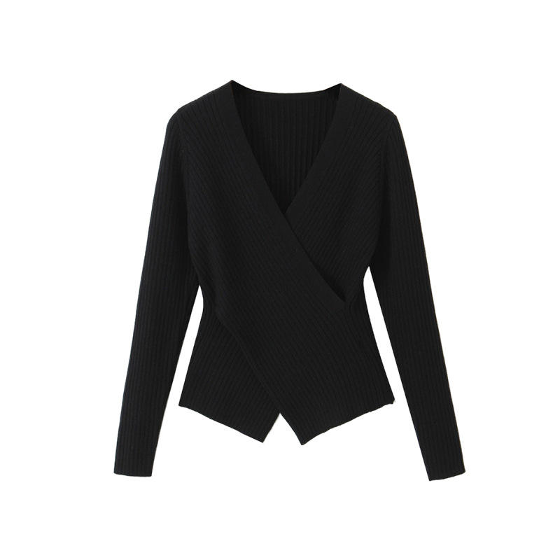 Haut en maille côtelée douce à col en V croisé style Ins pour femme, coupe ajustée, manches longues, grande taille, tendance